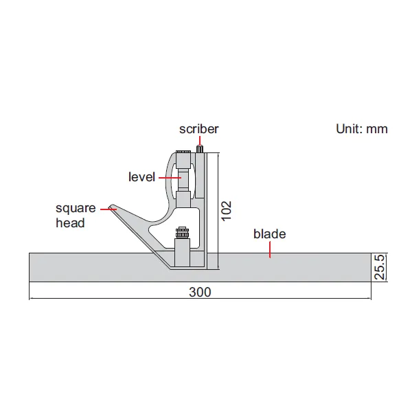 độ chính xác: ±0.5° - Lưỡi dao (làm bằng thép không gỉ): dải đo: 300 mm/12″, vạch chia: 1 mm và 1/32″ ở mặt trước, 1 mm và 1/16″ ở mặt sau