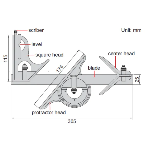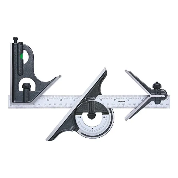 ±10 min cho góc 45° - Lưỡi dao (làm bằng thép không gỉ): dải đo 300 mm/12″, vạch chia: 0.5 mm và 11/32″ ở mặt trước, 1mm và 1/64″ ở mặt sau