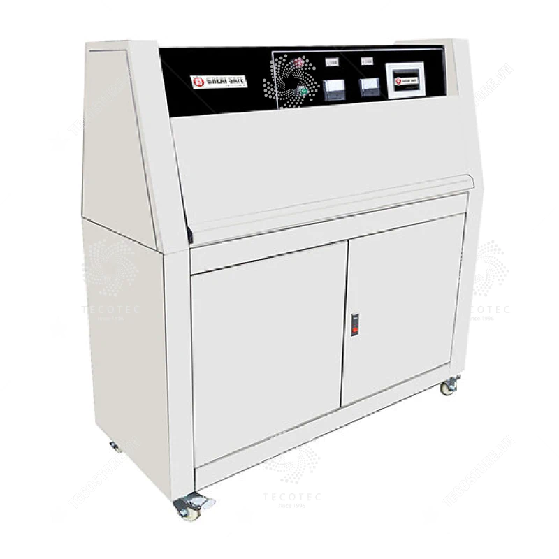 - Buồng thử nghiệm lão hóa UV kích thích sương và mưa có tính đến độ ẩm và/hoặc phun nước được trang bị đèn UV huỳnh quang có thể mô phỏng hoàn toàn quang phổ UV của ánh sáng mặt trời và cho vật liệu tiếp xúc với các chu kỳ luân phiên của ánh sáng UV, độ ẩm và nhiệt độ cao được kiểm soát. Phổ biến nhất cho các thử nghiệm thời tiết để kiểm tra các loại hư hỏng bao gồm thay đổi màu sắc, mất độ bóng, phấn hóa, nứt, mờ, phồng rộp, mất độ bền và oxy hóa.