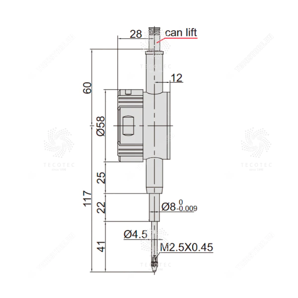 - Chức năng nút: Dung sai Hiển thị Go and No-Go, cài đặt trước dữ liệu, thay đổi hướng đo, max./min./TIR đo, chuyển đổi inch/số liệu, đo tuyệt đối/gia tăng