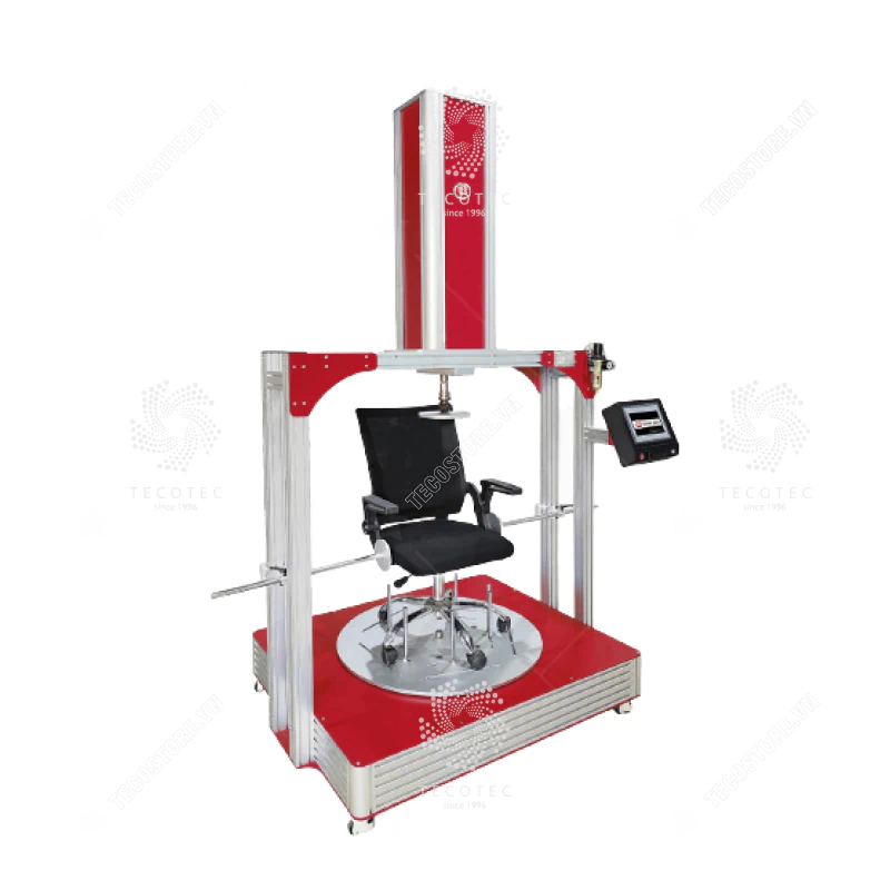 - Máy kiểm tra độ xoay được sử dụng để đánh giá khả năng chịu lực và mài mòn của ghế khi xoay nhiều lần. Trong quá trình thử nghiệm, chân ghế cần được cố định trên bàn xoay của máy và giữ cho ghế và tựa lưng được cố định để ảnh hưởng đến chuyển động quay của chân đế. Sau đó đặt vật nặng 122 kg (270 lb) lên ghế tại điểm tải, xoay ghế với tốc độ từ 5 đến 15 vòng quay mỗi phút và với tổng số góc quay từ 0°-360° trong 120,000 vòng quay