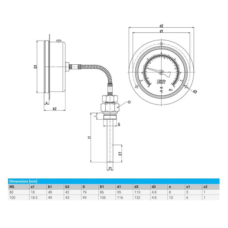 • Vỏ: Vòng uốn, thép không gỉ 1.4301 được đổ đầy dầu silicon (độ nhớt cao)