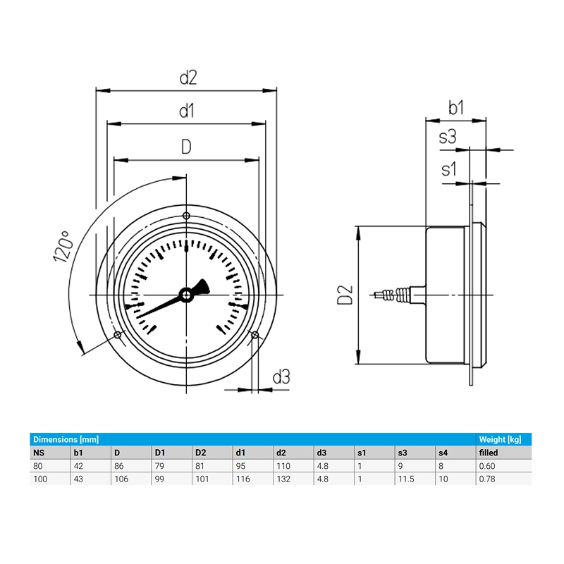 - Các dải hiển thị phổ biến là 0…100 °C, 0…120 °C, 0…160 °C, 0…200 °C và 50…650 °C, được trang bị ống nhúng trơn và đầu nối nén di động có ren ngoài G 1/2 hoặc G 3/4. Đường kính ống nhúng tiêu chuẩn là 12 mm (13 mm là tùy chọn không tính thêm phí)