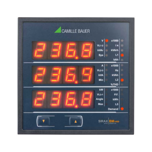 Thiết bị đo tham số điện năng SIRAX BM1400 phù hợp cho việc lắp đặt cố định và đo các thông số điện quan trọng trong hệ thống hạ thế. Chỉ báo rõ ràng về các giá trị đo được trên màn hình LED; Dễ dàng vận hành và thiết lập tham số đo tại chỗ; Tự động cuộn dữ liệu đo theo chu kỳ.