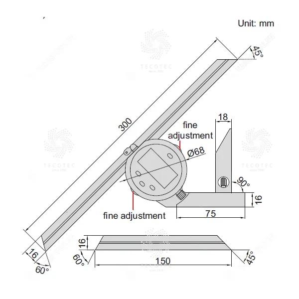 - Nút chức năng: chọn góc hiển thị 0-90°, 0-180° hoặc 0-360°; thay đổi độ phân giải, đảo chiều hiển thị, giữ dữ liệu, set 0, bật/tắt chức năng đo góc bù