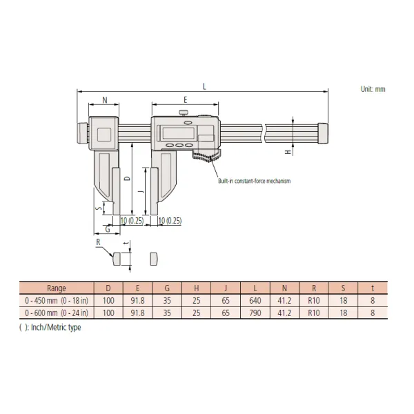 - Dải đo ngoài: 0-600 mm