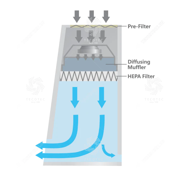 - 0.3 μm và các hạt lớn hơn được loại bỏ với hiệu suất 99.99%, bộ lọc HEPA kín, đáp ứng loại 10. (Tiêu chuẩn Liên bang Hoa Kỳ 209E) (tuổi thọ trung bình của bộ lọc HEPA: 3 năm – tùy thuộc vào điều kiện phòng thử nghiệm) (tùy chọn)